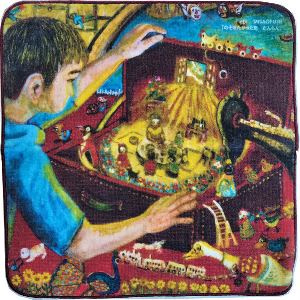 藤井節の油絵「のぞきたかった窓 だんらん」をプリントした、オリジナル今治ハンカチです。